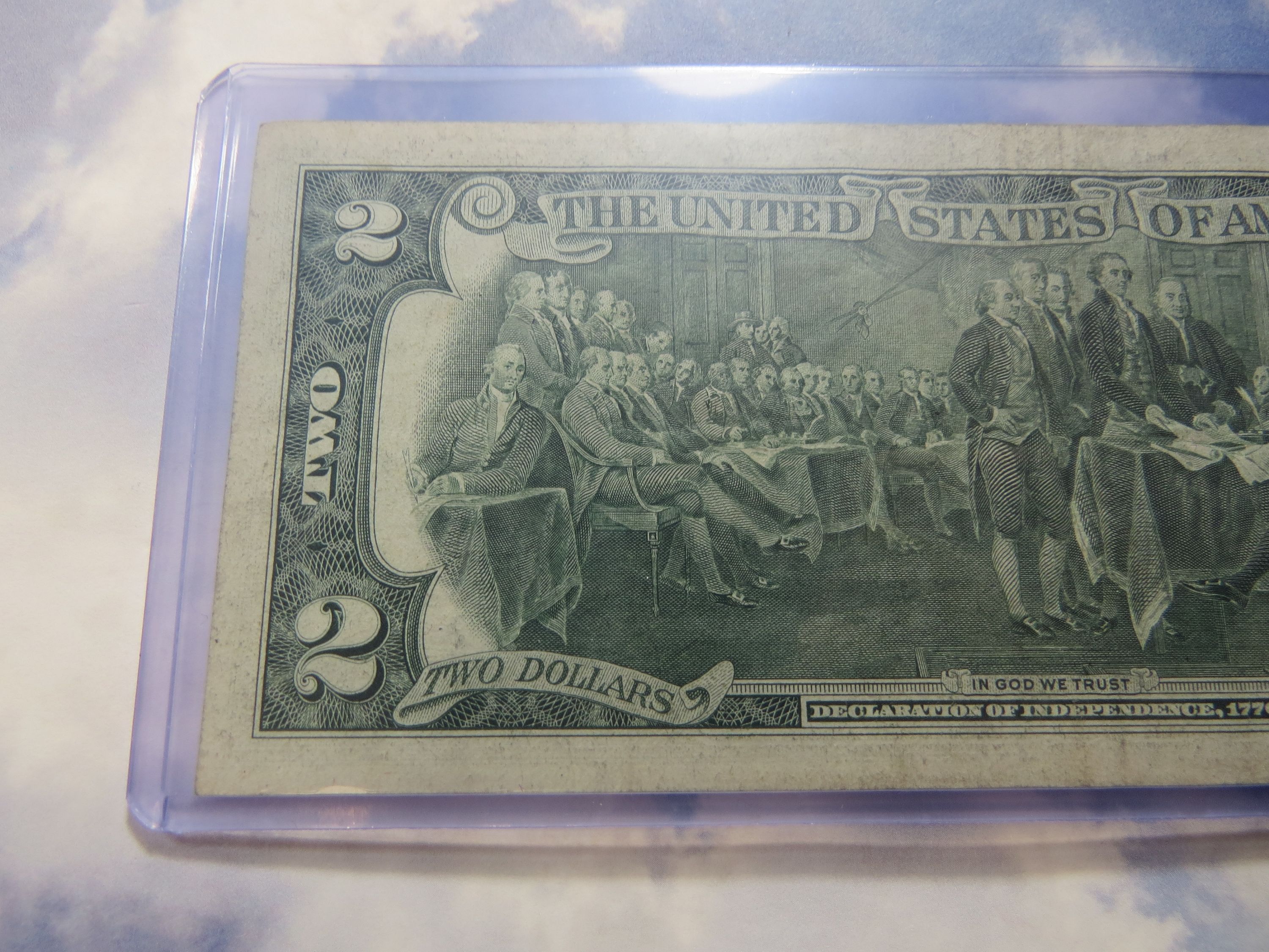 Interesting History about this $2.00 Note. Thomas Jefferson has been given credit for writing most of the Declaration of Independence on July 4, 1776. This Note has Thomas Jefferson's picture on the Note and it's dated exactly 200 years after the signing of the Declaration of Independence. The reverse side of the Note is a picture of the signing of the Declaration of Independence! Another interesting point is that next year (2026), will be the 250th Anniversary of the Declaration of Independence. One more thought is the fact that Thomas Jefferson passed away on the 50th Anniversary of the Declaration of Independence (July 4, 1826)!