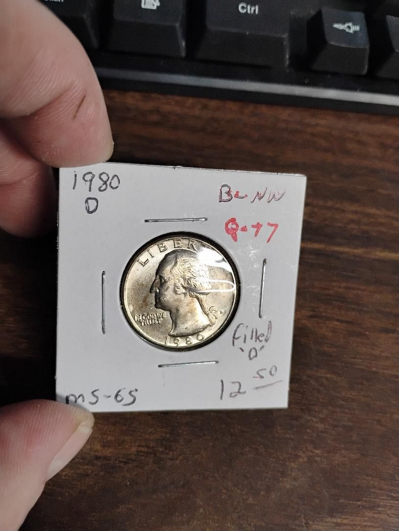 1980-D WASHINGTON QUARTER MS-65 TONING, FILLED "D" ERROR COIN
