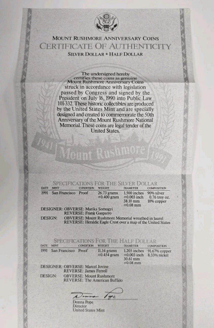 1991 US Mint  Mt Rushmore 2 Coin Commemorative Set1991 US Mint  Mt Rushmore 2 Coin Commemorative Set