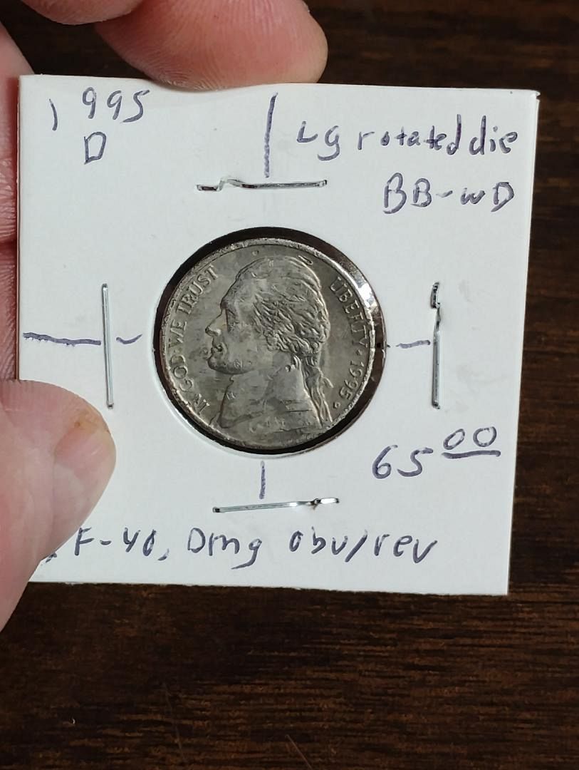 1995-D JEFFERSON NICKEL LARGE ROTATED DIE, XF-40, DETAILS: DAMAGE OBV. & REV.