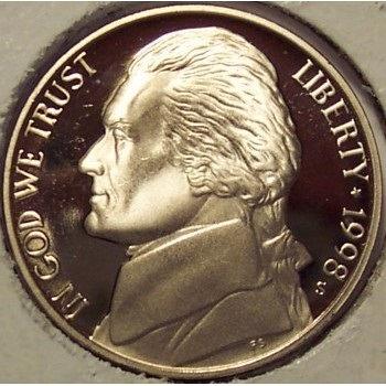 Up for sale, a 1998-S DEEP CAMEO Proof Jefferson Nickel that I would judge to be no less than PF65, but check the photos and make your own grading determination. The coin you see is the coin you will receive. No stock photos or switched out coins. I have a 7 day money back guarantee. I will combine shipping charges. Add an additional 15 cents for each additional coin. Orders totaling over $10 will be shipped FREE. All grading estimates are just that, estimates based on experience and a little help from Photograde. If the photos are not clear or you have any questions, please feel free to email me. Thanks for shopping at Grandpaw's Attic.