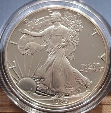 Check or Money OrderFor Sale is a 1999 Silver American Eagle coin Enhanced With Gold Overlay. This coin has a fineness of 0.999 silver. Produced by the U.S. Mint, this coin contains 1 oz of precious metal content and is in business strike type. It is a better date coin commanding a bit better price, making it a valuable addition to any coin collection or investment portfolio. The coin is in a plastic holder, any scratches in picture are on the plastic not the coin. Will combine shipping and no reserve. USPS Just raised rates again.