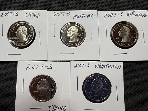 Up for sale is a complete 2007-S Proof State Quarter Set from the San Francisco Mint. This five-coin set includes beautifully struck proof examples featuring sharp details and deep mirrored fields with frosted designs. Each coin exhibits strong Cameo contrast, typical of San Francisco proofs.