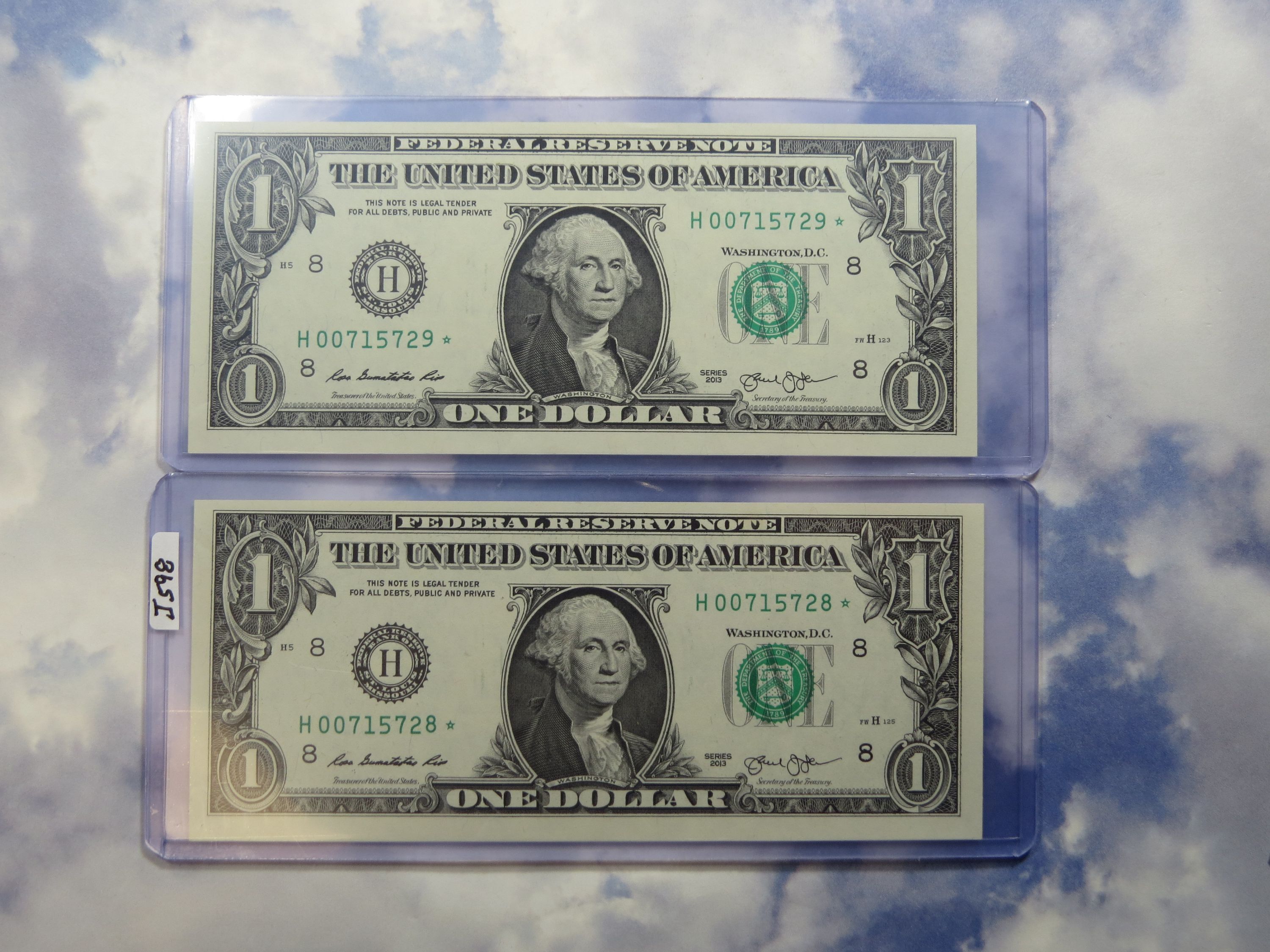 Check or Money OrderSeries 2013 Federal Reserve Notes - *STAR NOTES* - (Lot of 2 Notes in Serial Number Sequence) Green Seal - Lot J598