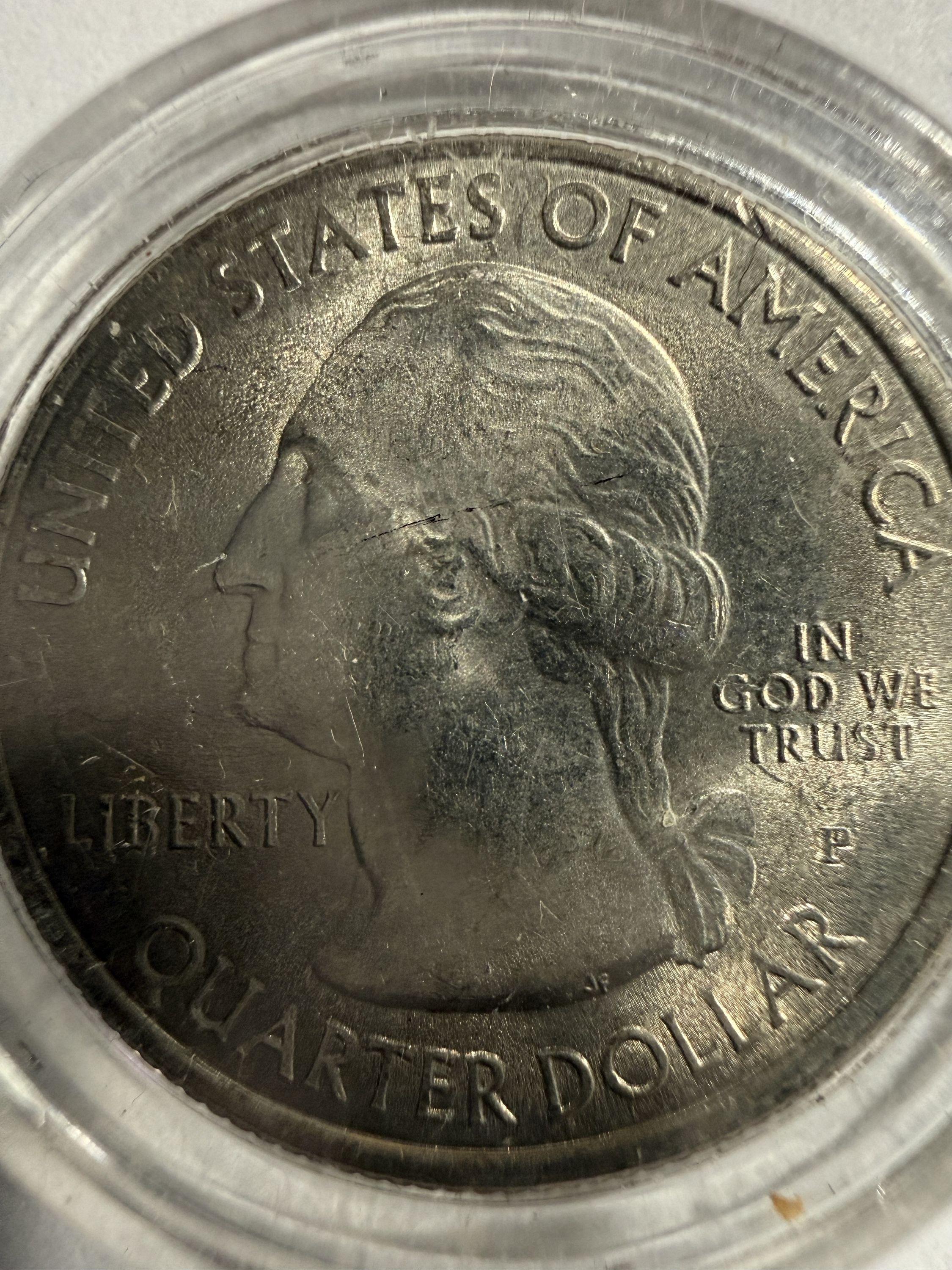 Appears to have double/offset strike in the letters for "We Trust" and mint mark "P"
