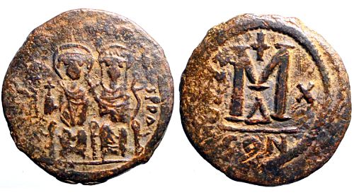 Obv: D N IVSTINVS P P, Justin and Sophia, both nimbate, enthroned facing, Justin holding globus cruciger and Sophia holding cruciform scepter.