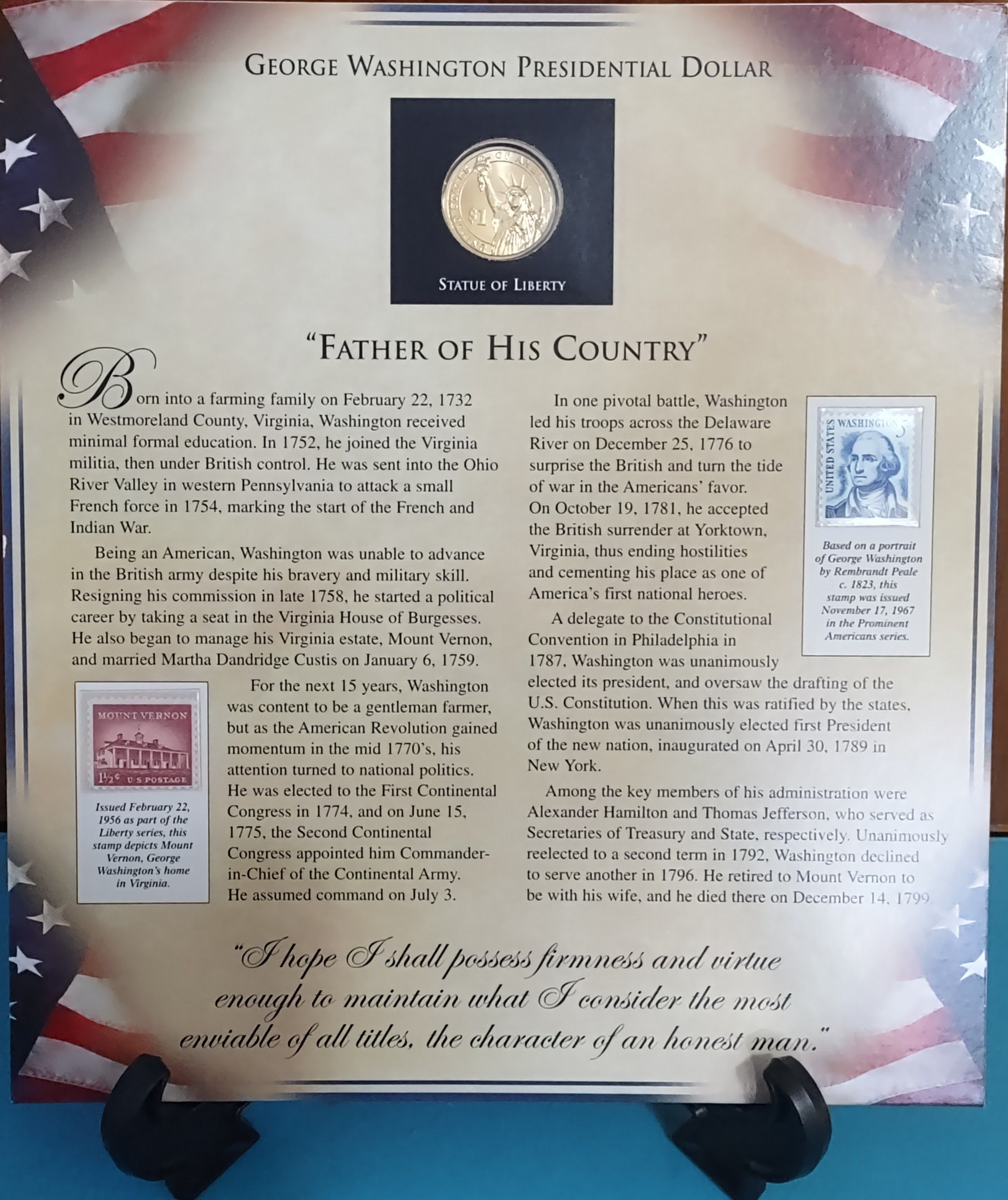 This two-volume set displays Presidential $1 dollar coins, collectible stamps, and history lessons for each president from George Washington to George H. W. Bush. Each president is represented on a beautiful cardboard “page” on which their Presidential $1 coin and stamps are mounted. Each President’s page includes a colorful presidential portrait and brief historical summaries that highlight their lives and the challenges they faced as presidents. Each cardboard page is enclosed in a protective plastic sleeve that is mounted in either Volume 1 or 2.