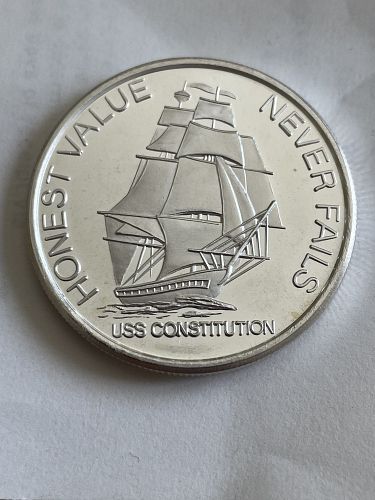 I have a USS CONSTITUTION HONEST VALUE NEVER FAILS silver round for sale. It is one ounce of .999 fine silver and contains the USS Constitution ship.  On the other side is the similar site of the Morgan silver dollar reverse.  I have a few for sale and this pic is representative of the one you will receive.  Please review the pics closely before purchasing.