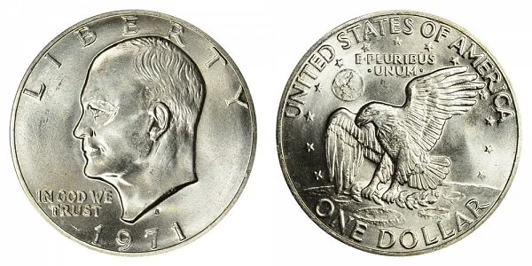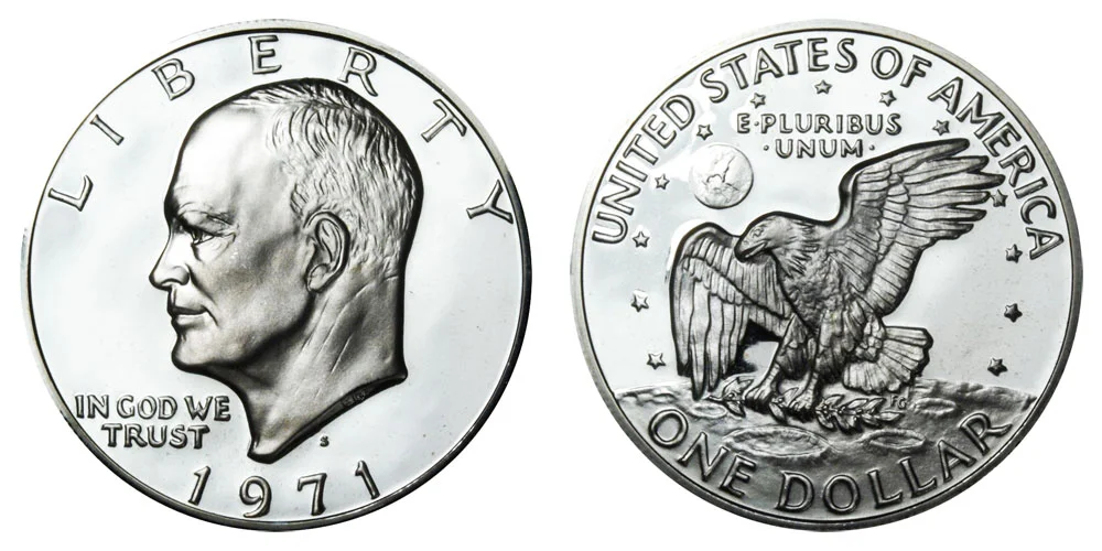 The other version is the 1971 S Silver Proof Eisenhower Dollar which came in proof sets or brown boxes with a gold eagle seal ("Brown Ikes") - only 4265234 of these mirror-like silver proof coins were produced. An example of the proof version is depicted below: