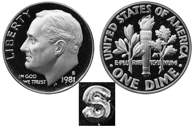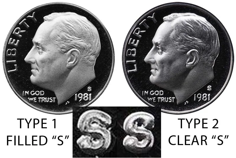 The San Francisco Mint produced two different varieties of the 1981 S Proof Roosevelt Dime where one had a filled in S and the other had a Clear S. Depicted in the example image of the coin above is the Type 1 filled S version. This can be best identified by the S being filled in and not as clear. Below is a close-up image comparing the Type 1 Filled S vs the Type 2 Clear S. Click the image to enlarge: