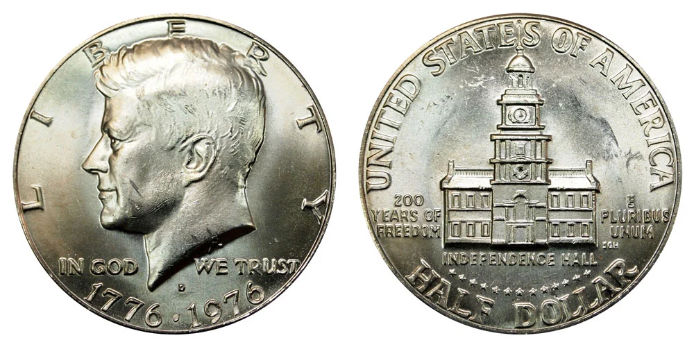The bicentennial Kennedy Half Dollar features a 1776-1976 date on the obverse and a portrait of Philadelphia Pennsylvania's Independence Hall with the words "200 YEARS OF FREEDOM" on the reverse of the coin to celebrate the 200th anniversary of the United States of America. This coin was produced in both years of 1975 through 1976 so there were no 1975 coins.